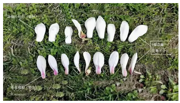 ▲白玉蘭:9瓣花瓣,花萼不分化,花被片純白為栽種型,基部稍粉為野生型。(圖片來源:網(wǎng)絡(luò))