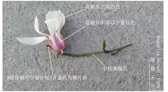 ▲望春玉蘭:花被片中部以下紫紅色,上部白色。9枚花被片中最外輪3片退化為萼片狀。(圖片來源:網(wǎng)絡(luò))