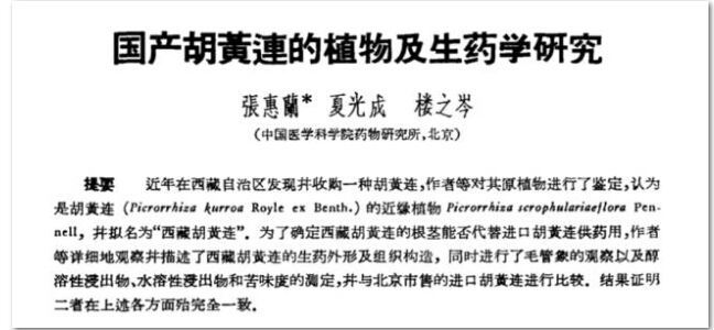 1960年中國(guó)醫(yī)科院藥物研究所科學(xué)家在相繼在西藏、云南發(fā)現(xiàn)了西藏胡黃連,認(rèn)為它的成分、性狀、功效均可代替進(jìn)口貨作藥材胡黃連用,因此1990年至今的國(guó)家藥典都將它作正品用。摘自《藥學(xué)學(xué)報(bào)》1965年12卷 12期(著名的生藥學(xué)家樓之岑老先生可是諾獎(jiǎng)獲得者屠呦呦的恩師呦) 胡黃連,玄參科胡黃連屬植物,一種多年生矮小草本。葉基生成蓮座狀,卵形,葉邊有鋸齒;花序穗狀,著生于花葶頂端,花冠深紫色;蒴果長(zhǎng)卵形;花果期7-9月。產(chǎn)西藏南部、云南西北部、四川西部;生海拔3600-4400米高山草地及石堆或淺土層的向陽(yáng)處。 胡黃連藥用部位為粗壯的根狀莖,其性寒,味苦;歸肝、胃、大腸經(jīng);可清熱燥濕、瀉火解毒。一般我們?cè)谑袌?chǎng)看見(jiàn)的藥材,都是條狀的根莖或飲片,已經(jīng)看不到葉子和花了,所以很難辨認(rèn)真?zhèn)蝺?yōu)劣。通過(guò)下面幾張圖,我們來(lái)看看胡黃連的優(yōu)劣。 其有效成分是胡黃連苷Ⅰ和胡黃連苷Ⅱ,經(jīng)檢測(cè),以下2組性狀不同的藥材含量也有明顯的差異:根莖較粗壯,直徑約為0.6~1.1cm,段較長(zhǎng),略彎、偶有分枝。鱗片狀葉柄多脫落,露出密集的環(huán)狀節(jié);凸起的根痕或芽痕較少;質(zhì)稍軟,更易折斷。根莖多細(xì)小,多為直徑0.4~0.8的小段,段長(zhǎng)短不一,彎曲較多、不規(guī)律,分枝多。表面鱗片較多處質(zhì)軟,表面具縱皺紋,環(huán)狀節(jié)較少,凸起較多,鱗片未脫落處表面及皮部呈黑色。 左—含量較高—白色維管束排列成規(guī)律的環(huán)狀;可見(jiàn)明顯的射線;皮部淡棕色至棕色,略帶紅色;皮部結(jié)構(gòu)較密實(shí)、相對(duì)較厚; 右—含量較低—維管束較小,排列不規(guī)則;射線難分辨;皮部棕色至黑色、不顯紅色;皮部結(jié)構(gòu)較松散、孔隙多、較薄。 以上2組圖均為正品胡黃連,只是含量有所差異。本人愚見(jiàn),認(rèn)為含量較高者(左上、左下)為西藏胡黃連,含量較低者(右上、右下)為胡黃連。 由于西藏胡黃連為野生植物,分布區(qū)狹窄,加上連年采挖,資源瀕臨滅絕,已被云南省列為重點(diǎn)發(fā)展的稀缺藥材品種,并被收載于《中國(guó)珍稀瀕危植物名錄》。所幸云南麗江已成功栽培出可替代野生的家種品,為野生珍稀植物的保護(hù)提供了途徑。