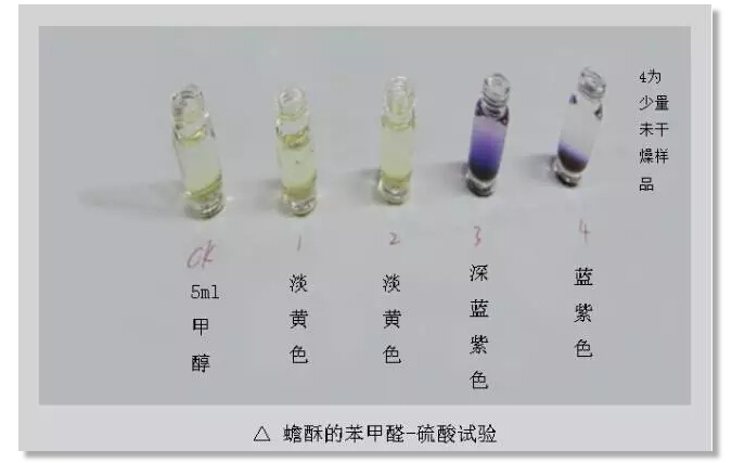 按傳統(tǒng)蟾酥鑒別法,若遇水起泡沫則是蟾酥正品,則可初步推斷樣品2是偽品,樣品1、3疑似正品,為了進(jìn)一步證明推斷是否正確,來試試顯色法。