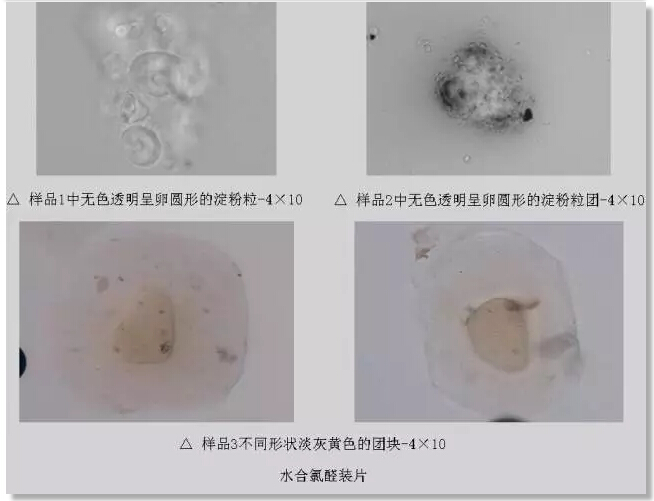與在樣品4中發(fā)現(xiàn)的動(dòng)物組織相比,更令我驚訝的是在樣品1、2中發(fā)現(xiàn)了淀粉顆粒,不過這無色透明呈卵圓形的淀粉粒看著還蠻晶瑩剔透的,只是可惜了都是偽品吶,要知道蟾酥很貴的好不,不要什么淀粉、泥砂、牙膏、肥皂都拿來充次好嗎?