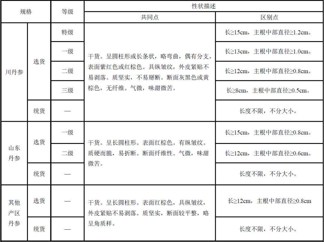 苦,微寒。歸心、肝經(jīng)。根據(jù)市場流通情況,根據(jù)產(chǎn)地的不同將丹參藥材分為“川丹參”、“山東丹參”和“其他產(chǎn)區(qū)丹參”三個規(guī)格,對藥材是否進(jìn)行等級劃分,將丹參分為“選貨”和“統(tǒng)貨”兩個規(guī)格。在此規(guī)格下主要按照根的直徑進(jìn)行等級的劃分,即直徑越大等級越高。