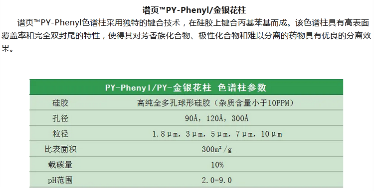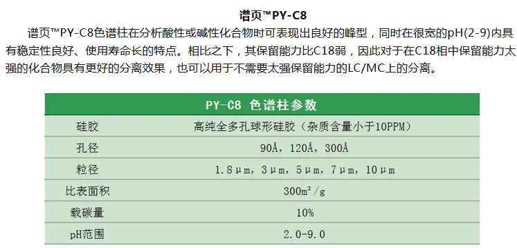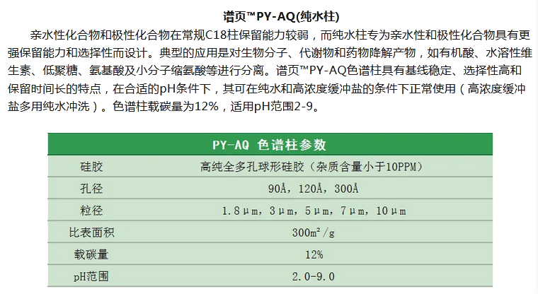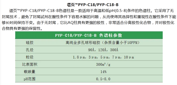 譜頁(yè)?PY-C18是本系列C18柱中最具普適性的色譜柱,具有優(yōu)異的穩(wěn)定性、獨(dú)特的官能團(tuán)鍵合及均勻的小分子封尾技術(shù)涂層,確保固定相具有高選擇性。加上獨(dú)有的裝柱工藝,使其擁有穩(wěn)定的基床,從而具有更高的柱效及批次間穩(wěn)定性。適合分離酸性、中性和堿性化合物以及小分子多肽等。