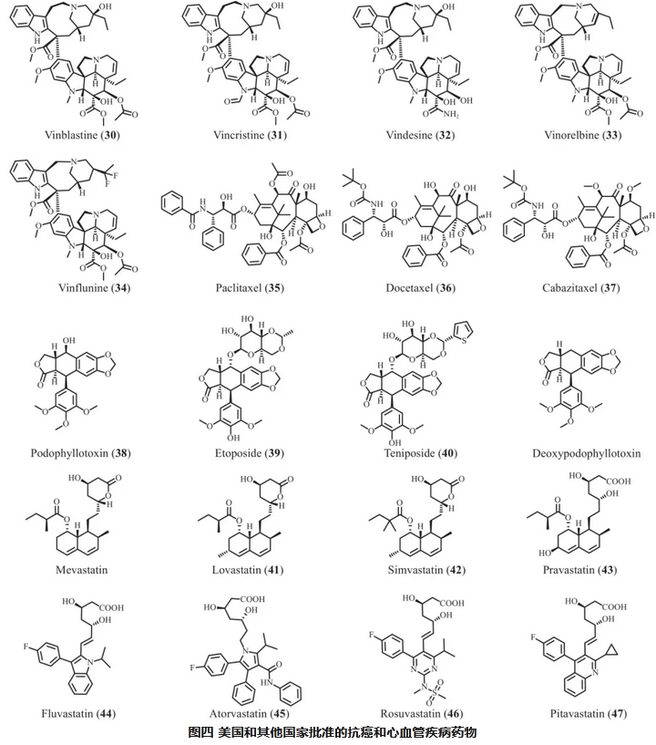 根據(jù)各種疾病的臨床治療需求,本綜述介紹了65種具有代表性的藥物,這些藥物或直接來源于天然產(chǎn)物,或來源于天然產(chǎn)物的衍生物。這些藥物已獲得國家醫(yī)藥產(chǎn)品管理局(NMDA)、美國食品藥品監(jiān)督管理局(FDA)、歐洲藥品管理局和日本藥品醫(yī)療器械管理局等監(jiān)管機構(gòu)的批準。在這些藥物中,有29種是在中國開發(fā)的,其余36種是在國際上獲得批準的。