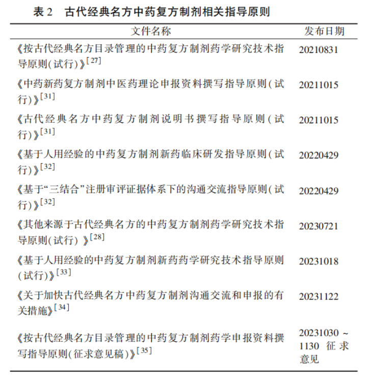 2019年12月以來(lái)新型冠狀病毒肺炎在全球蔓延,在這次抗擊疫情過(guò)程中,中醫(yī)藥通過(guò)臨床篩選出的有效方劑發(fā)揮了重要的作用??挂咂陂g,國(guó)家藥監(jiān)局采取早期介入、研審聯(lián)動(dòng)等措施,邊審評(píng)、邊研究、邊總結(jié),探索優(yōu)化中藥注冊(cè)分類,批準(zhǔn)了多個(gè)古代經(jīng)典名方中藥復(fù)方制劑:2021 年 3 月 2 日,源自抗疫“三方”的清肺排毒顆粒、化濕敗毒顆粒、宣肺敗毒顆粒通過(guò)特別審批程序上市;2022 年10 月 9 日,散寒化濕顆粒上市。為促進(jìn)古代經(jīng)典名方制劑研發(fā),推進(jìn)疫情防控成果轉(zhuǎn)化,藥審中心將審評(píng)的經(jīng)驗(yàn)進(jìn)行總結(jié),制定了古代經(jīng)典名方復(fù)方制劑的相關(guān)指導(dǎo)原則(表 2),加強(qiáng)技術(shù)標(biāo)準(zhǔn)體系建設(shè),全程加速相關(guān)品種的研發(fā)、申報(bào)和審評(píng)進(jìn)度。2022 年 12 月 28 日首個(gè)中藥3. 1類制劑苓桂術(shù)甘顆粒獲批上市,2023 年以來(lái),枇杷清肺顆粒、濟(jì)川煎顆粒、一貫煎顆粒和芍藥苷草顆粒等多個(gè)中藥3. 1類品種獲批上市。