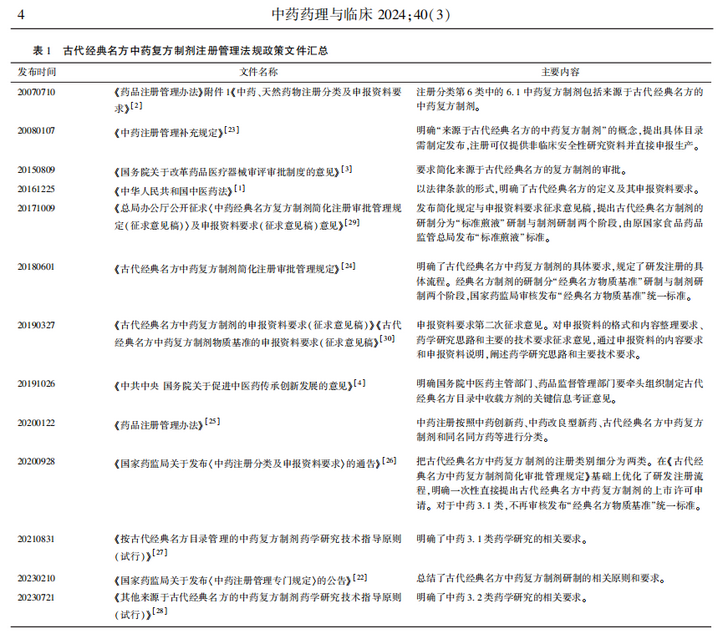 2015年《國(guó)務(wù)院關(guān)于改革藥品醫(yī)療器械審評(píng)審批制度的意見(jiàn)》明確要求“簡(jiǎn)化來(lái)源于古代經(jīng)典名方的復(fù)方制劑的審批”。2016 年《中華人民共和國(guó)中醫(yī)藥法》(以下簡(jiǎn)稱《中醫(yī)藥法》) 明確“古代經(jīng)典名方,是指至今仍廣泛應(yīng)用、療效確切、具有明顯特色與優(yōu)勢(shì)的古代中醫(yī)典籍所記載的方劑?!?“生產(chǎn)符合國(guó)家規(guī)定條件的來(lái)源于古代經(jīng)典名方的中藥復(fù)方制劑,在申請(qǐng)藥品批準(zhǔn)文號(hào)時(shí),可以僅提供非臨床安全性研究資料。具體管理辦法由國(guó)務(wù)院藥品監(jiān)督管理部門會(huì)同中醫(yī)藥主管部門制定?!?這一立法規(guī)定大大加快了該類中藥復(fù)方制劑研究申報(bào)注冊(cè)的相關(guān)進(jìn)程,特別是相關(guān)注冊(cè)管理法規(guī)政策文件的出臺(tái)。見(jiàn)表1。2018年國(guó)家藥監(jiān)局發(fā)布了《古代經(jīng)典名方中藥復(fù)方制劑簡(jiǎn)化注冊(cè)審批管理規(guī)定》,明確“經(jīng)典名方制劑的研制分‘經(jīng)典名方物質(zhì)基準(zhǔn)’研制與制劑研制兩個(gè)階段”,國(guó)家藥監(jiān)局發(fā)布統(tǒng)一“經(jīng)典名方物質(zhì)基準(zhǔn)”,可以分兩個(gè)階段提交申報(bào)資料。2020年新版《藥品注冊(cè)管理辦法》在中藥注冊(cè)分類中新增了古代經(jīng)典名方中藥復(fù)方制劑分類,并在隨后發(fā)布的《國(guó)家藥監(jiān)局關(guān)于發(fā)布〈中藥注冊(cè)分類及申報(bào)資料要求〉的通告》中將其細(xì)分為“按古代經(jīng)典名方目錄管理的中藥復(fù)方制劑” ( 以下簡(jiǎn)稱中藥 3. 1 類)和“其他來(lái)源于古代經(jīng)典名方的中藥復(fù)方制劑” (以下簡(jiǎn)稱中藥 3. 2 類)兩種情形,明確“注冊(cè)申請(qǐng)人一次性直接提出古代經(jīng)典名方中藥復(fù)方制劑的上市許可申請(qǐng)”,“不再審核發(fā)布‘經(jīng)典名方物質(zhì)基準(zhǔn)’統(tǒng)一標(biāo)準(zhǔn)”,從而進(jìn)一步簡(jiǎn)化了該類制劑的注冊(cè)流程。2023年《中藥注冊(cè)管理專門規(guī)定》明確了古代經(jīng)典名方中藥復(fù)方制劑“不需要開(kāi)展非臨床有效性研究和臨床試驗(yàn)”,并明確了該類制劑注冊(cè)管理總體要求、審評(píng)模式等。國(guó)家藥監(jiān)局藥品審評(píng)中心(以下簡(jiǎn)稱藥審中心) 分別于2021年和2023年發(fā)布了《按古代經(jīng)典名方目錄管理的中藥復(fù)方制劑藥學(xué)研究技術(shù)指導(dǎo)原則(試行)》和《其他來(lái)源于古代經(jīng)典名方的中藥復(fù)方制劑藥學(xué)研究技術(shù)指導(dǎo)原則(試行)》,明確了中藥 3. 1 類和中藥 3. 2 類的藥學(xué)研究要求。