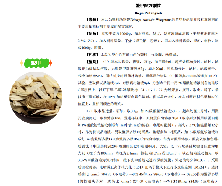 鱉甲來源于鱉科動物鱉Trionyx sinensis Wiegmann 的背甲,常以生鱉甲醋炙,可去除其腥味,藥性易于煎出。鱉甲具有滋陰潛陽,軟堅散結(jié),退熱除蒸的功效,臨床主要用于治療陰虛發(fā)熱,虛風(fēng)內(nèi)動,癥瘕等病癥。普思生物新品鱉源多肽I、鱉源多肽II對照品,有效對鱉甲、醋鱉甲配方顆粒進行質(zhì)量控制。