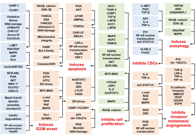1.誘導(dǎo)細(xì)胞周期阻滯與凋亡:通過上調(diào)促凋亡蛋白(Bax、p53)和抑制抗凋亡蛋白(Bcl-2、Bcl-xL),激活線粒體途徑和Caspase級(jí)聯(lián)反應(yīng),導(dǎo)致癌細(xì)胞死亡;同時(shí)通過抑制CDK/cyclin復(fù)合物,阻滯細(xì)胞周期于G2/M期。[1]