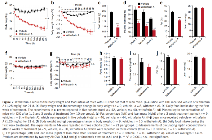 醉茄素A通過增強(qiáng)瘦素(leptin)敏感性顯著改善飲食誘導(dǎo)肥胖(DIO)小鼠的代謝異常(圖6)。此外,醉茄素A獨(dú)立于瘦素增敏作用,直接改善葡萄糖代謝。為開發(fā)新型抗肥胖藥物提供了新思路,具備臨床轉(zhuǎn)化潛力。[5]