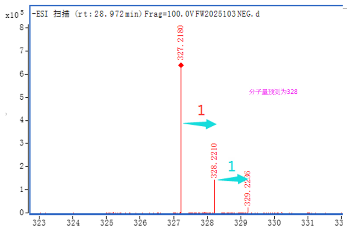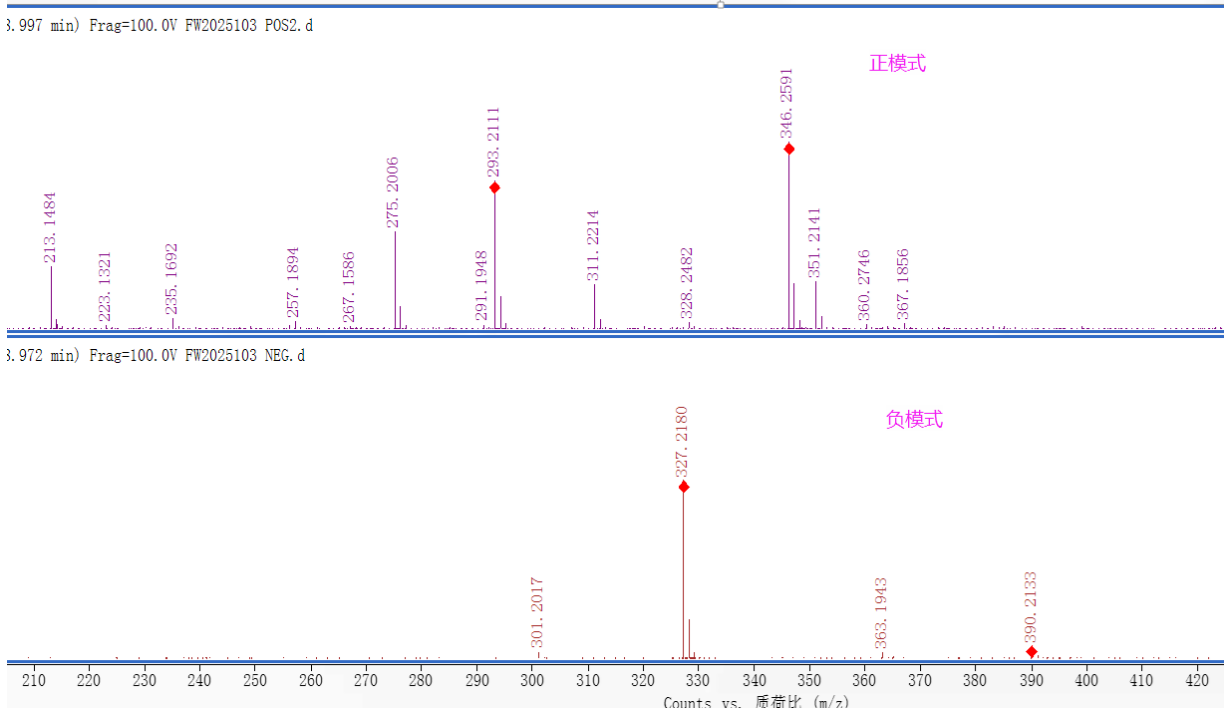 分子量預(yù)測(cè)過程中,最容易導(dǎo)致誤判的是圖中出現(xiàn)的看似“相關(guān)”的干擾離子,如[M+NH4]+與[M]+,[M-H2O+H]+與[M +H]+都是間隔18。如下圖中,275與293,328與346均間隔18,單正模式,無法確定分子量為292還是328。但結(jié)合負(fù)模式可確定為328。