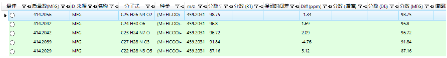 對(duì)于軟件擬合的分子式,可通過“N規(guī)則”、天然產(chǎn)物常見元素、擬合的質(zhì)量偏差、擬合分?jǐn)?shù)等進(jìn)行進(jìn)一步縮小范圍,獲得最可能的分子式結(jié)果,以獲得更準(zhǔn)確結(jié)果。