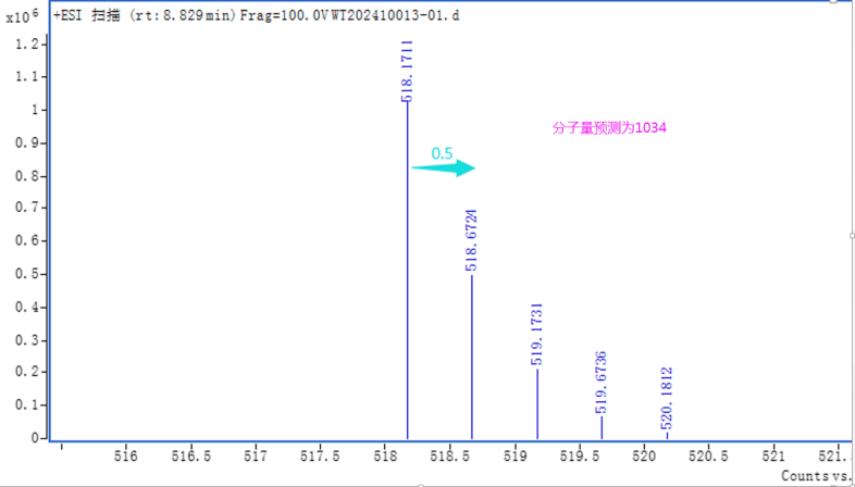 特別要注意的是,同位素間隔除了與元素種類相關(guān),也與電荷態(tài)相關(guān),也是容易出現(xiàn)預(yù)測(cè)失誤的關(guān)鍵點(diǎn)。通常情況下,同位素間隔=1/電荷態(tài)。如同位素間隔為0.5,則為雙電荷,分子量往往為分子離子的2倍。