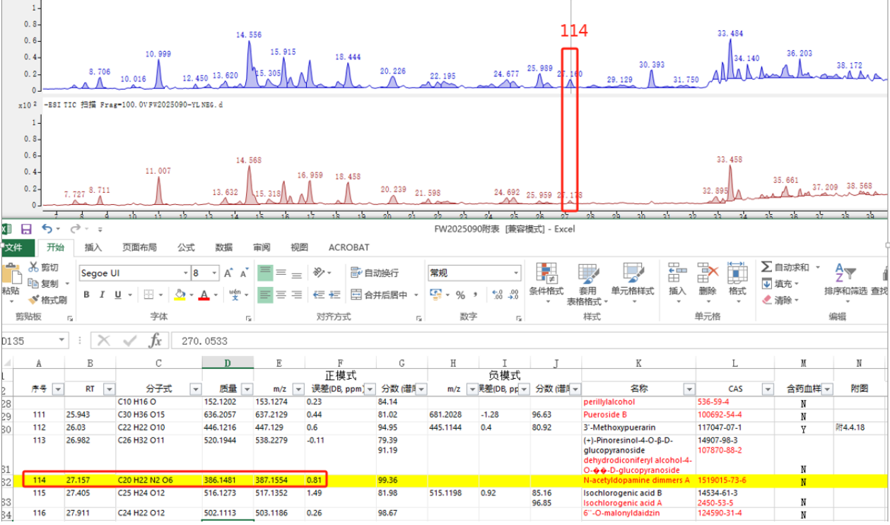 當(dāng)然,要保證結(jié)果的準(zhǔn)確性,單依賴數(shù)據(jù)庫是遠(yuǎn)遠(yuǎn)不夠的。人工審核有助于排除假陽性和假陰性結(jié)果。如下圖114號(hào)峰,數(shù)據(jù)庫判定為分子量386的化合物,但通過回歸質(zhì)譜峰發(fā)現(xiàn),該峰有兩個(gè)明顯分子離子峰387和563。那么563就是一個(gè)假陰性結(jié)果,387如果是563的碎片就是一個(gè)假陽性結(jié)果,需要進(jìn)一步通過二級(jí)碎片去驗(yàn)證。