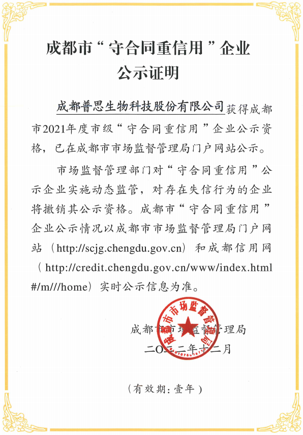 普思生物榮獲2021年度成都市市級“守合同重信用”企業(yè)稱號