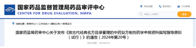 國家藥監(jiān)局藥審中心關(guān)于發(fā)布《按古代經(jīng)典名方目錄管理的中藥復(fù)方制劑藥學(xué)申報(bào)資料撰寫指導(dǎo)原則(試行)》的通告