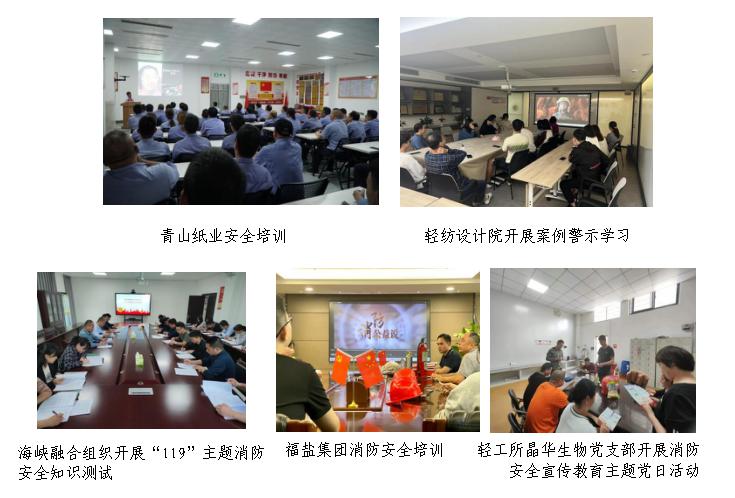 二是消防知識(shí)大學(xué)習(xí)。全系統(tǒng)上下組織開展消防安全知識(shí)培訓(xùn),以案為鑒強(qiáng)警示,敲響警鐘保安全。公司本部將消防宣傳月要求納入中心組學(xué)習(xí),圍繞“強(qiáng)化安全生產(chǎn)責(zé)任落實(shí) 有效防范化解各類安全風(fēng)險(xiǎn)”主題開展交流研討;青山紙業(yè)邀請(qǐng)福州民安消防有限公司高級(jí)講師開展了11場(chǎng)次的消防安全拓展培訓(xùn);海峽融合組織開展“119”主題消防安全知識(shí)測(cè)試;福鹽集團(tuán)、輕紡設(shè)計(jì)院、輕工所、金皇物業(yè)等組織專題培訓(xùn),傳達(dá)學(xué)習(xí)省政府、福建輕紡關(guān)于開展2023年消防宣傳月活動(dòng)的通知精神及《消防法》等法律法規(guī),組織人員觀看消防安全警示教育片和典型火災(zāi)事故案例,切實(shí)增強(qiáng)廣大員工消防安全意識(shí)。