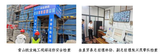 六是消防隱患大排查。進(jìn)一步壓緊壓實(shí)消防安全責(zé)任,將消防宣傳月活動(dòng)與鞏固深化消防安全重大風(fēng)險(xiǎn)隱患專項(xiàng)排查整治行動(dòng)相結(jié)合,組織排查整治各類安全隱患。福建輕安組織對(duì)本部、消防重點(diǎn)項(xiàng)目(青山紙業(yè)、山東魯麗木業(yè))進(jìn)行消防隱患重點(diǎn)排查,持續(xù)強(qiáng)化全鏈條安全隱患排查整治;金皇貿(mào)易領(lǐng)導(dǎo)帶隊(duì)前往消控室、機(jī)房、停車場(chǎng)等消防安全重點(diǎn)部位,認(rèn)真仔細(xì)開展安全檢查工作,及時(shí)、妥當(dāng)處理潛在安全風(fēng)險(xiǎn)隱患。